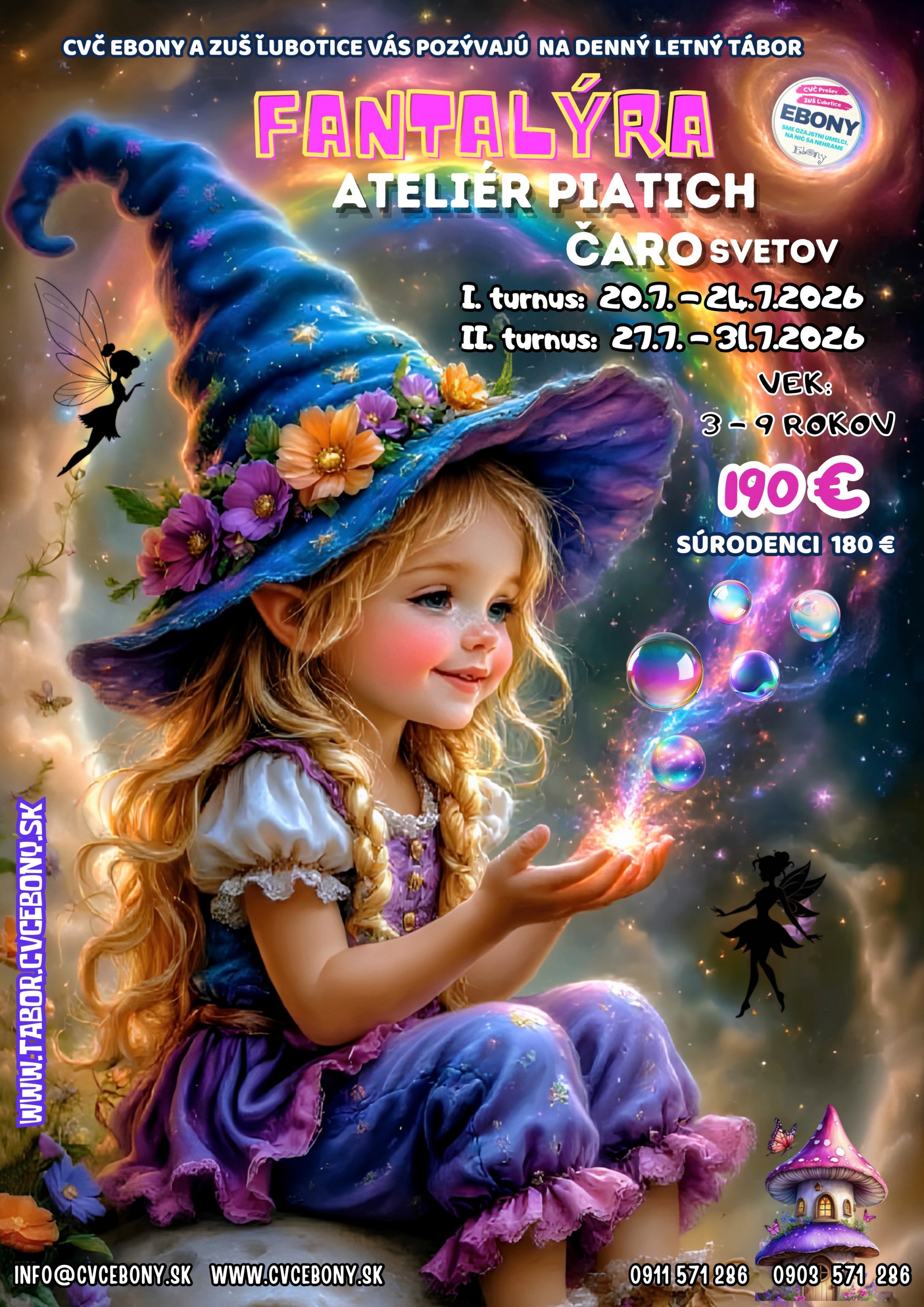 Každý rok počas letných prázdnin organizuje naša škola výnimočný umelecký hudobno-tanečný tábor, ktorý je venovaný zaujímavej téme. Tá aktuálna znie FANTALÝRA - ATELIÉR PIATICH ČAROSVETOV. Denný tábor je určený pre deti vo veku od 3 do 9 rokov a prebieha v dvoch turnusoch. Jeden turnus trvá 5 dní od pondelka do piatku, zvyčajne v čase od 7:00 do 16:30. Deti sa počas trvania tábora pripravujú na záverečný koncert s príjemným posedením pre rodičov.