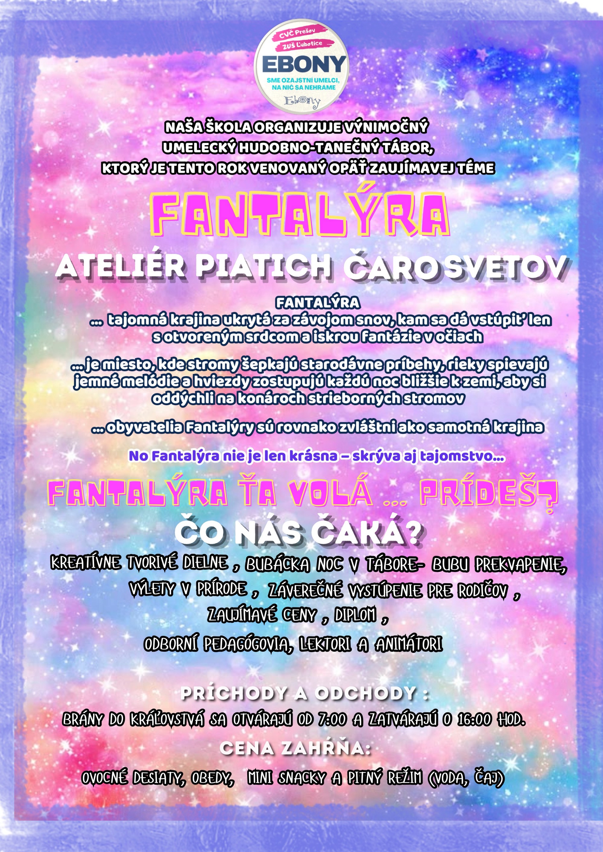 Po roku organizuje naša škola počas letných prázdnin výnimočný umelecký hudobno-tanečný tábor. Téma aktuálneho znie: FANTALÝRA - ATELIÉR PIATICH ČAROSVETOV. Denný tábor je určený pre deti vo veku od 3 do 9 rokov a prebieha v dvoch turnusoch. Jeden turnus trvá 5 dní od pondelka do piatku, zvyčajne v čase od 7:00 do 16:30. Deti sa počas trvania tábora pripravujú na záverečný koncert s príjemným posedením pre rodičov.